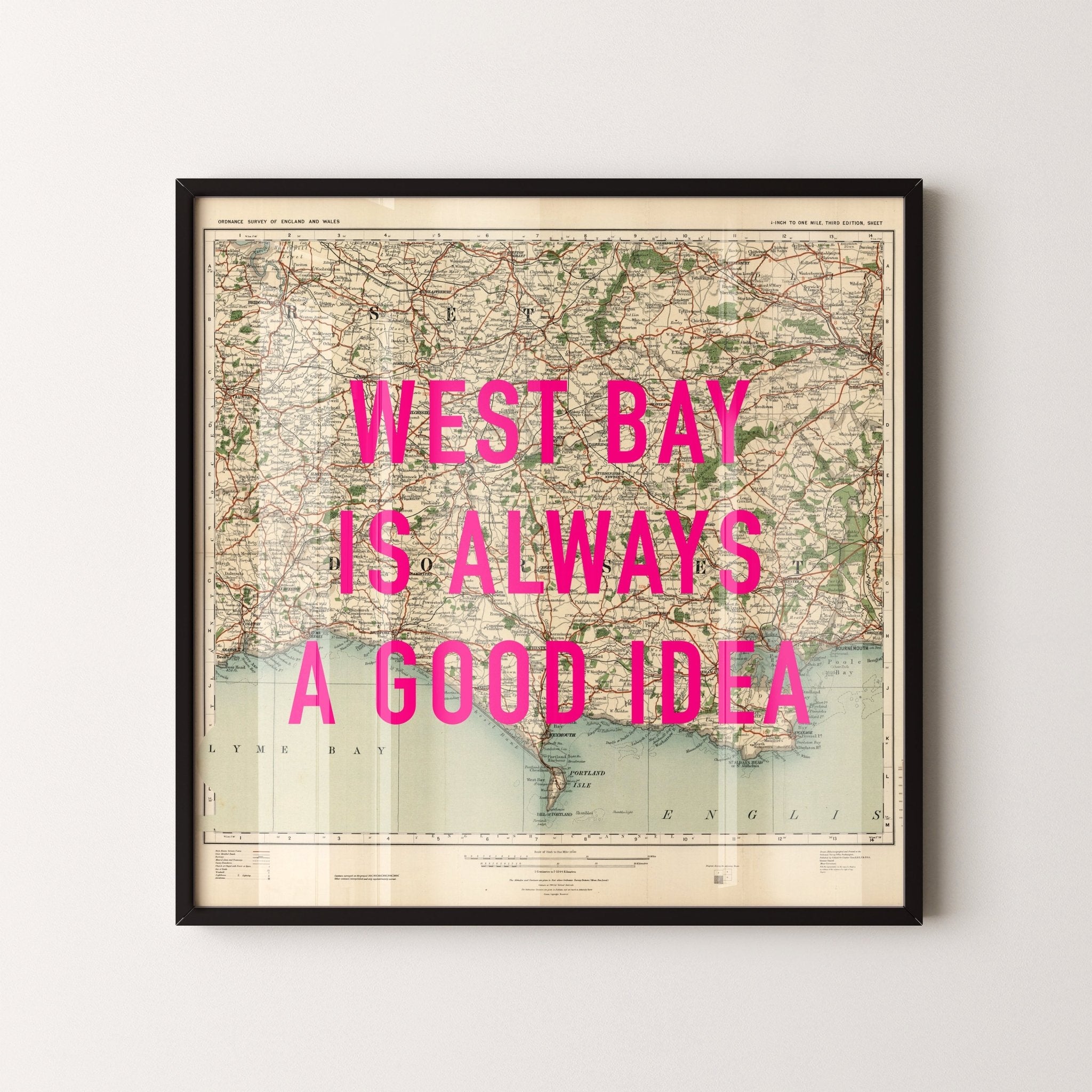 Each print is custom-made to feature a vintage map of West Bay and bold pop art text of your choice.
