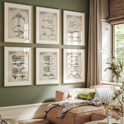 This set of 6 Star Trek spaceship patent prints includes the following: