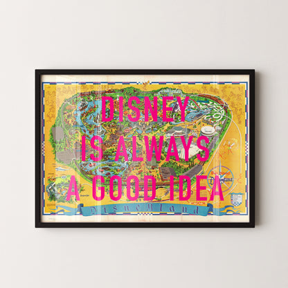 Each print features a vintage map of Disneyland California and bold pop art text of your choice.